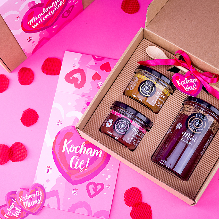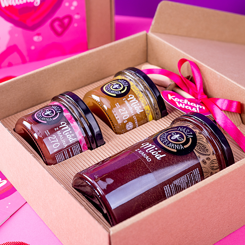 W tym eleganckim pudełku w opasce okolicznościowej znajdziesz idealny upominek na Walentynki. Wybierz 3 smaki miodu dla obdarowywanej osoby, niech poczuje się naprawdę słodko!