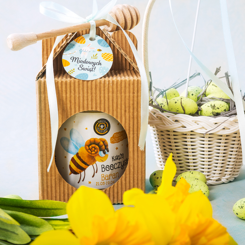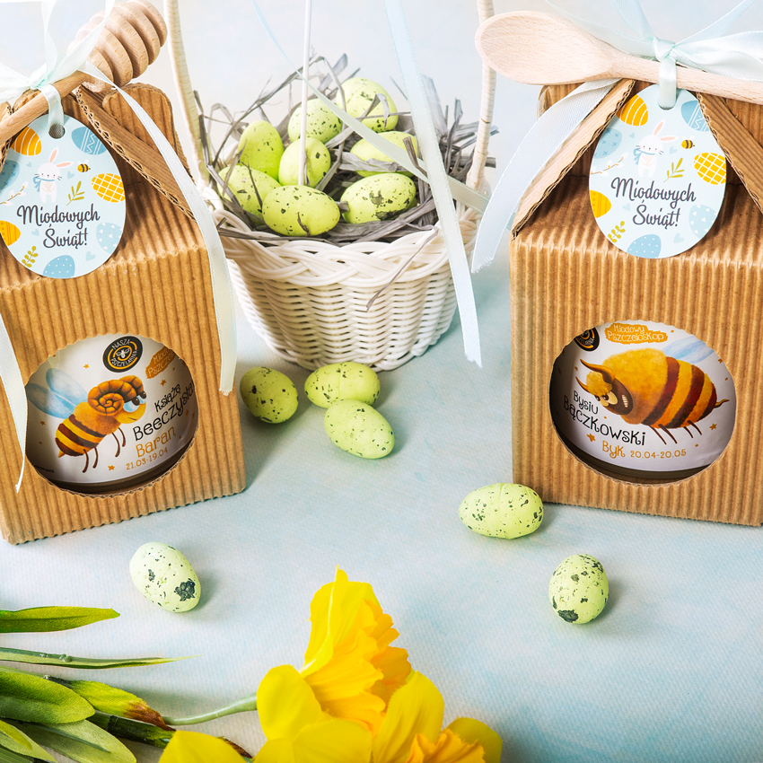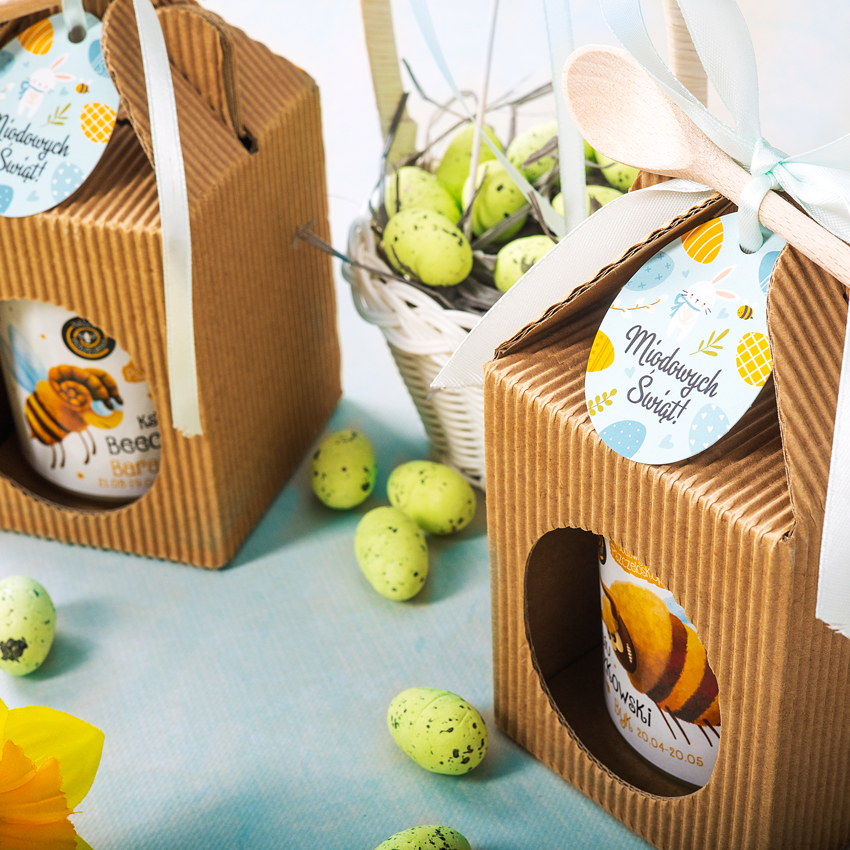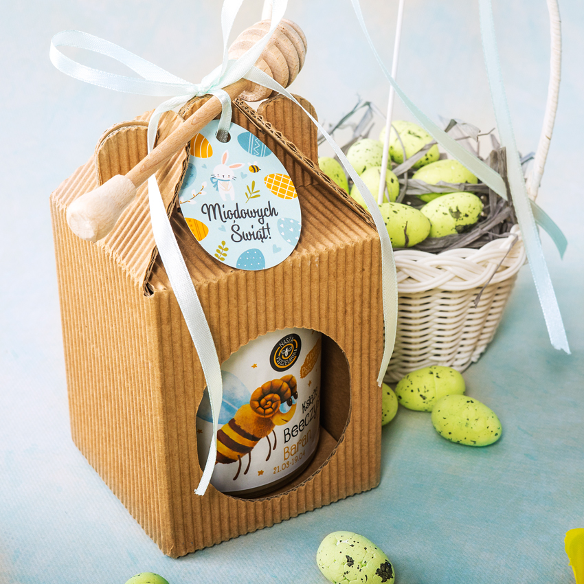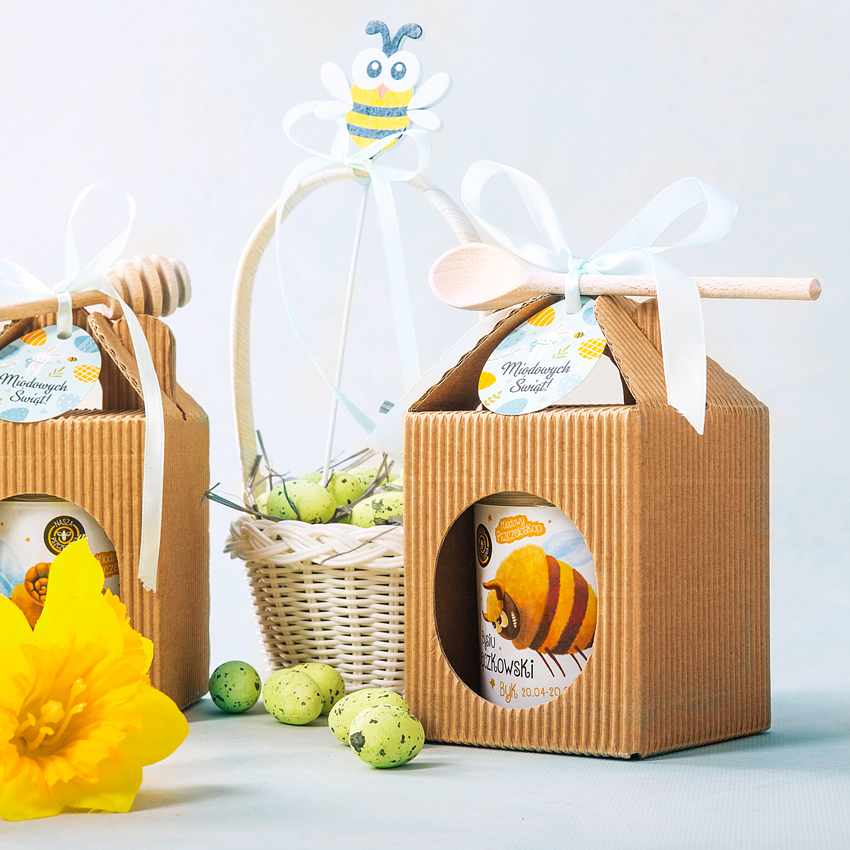 Słodki kartonik, w którym znajdzie się jeden wybrany słoik miodu! Mały prezent, który sprawdzi się przy każdej okazji.