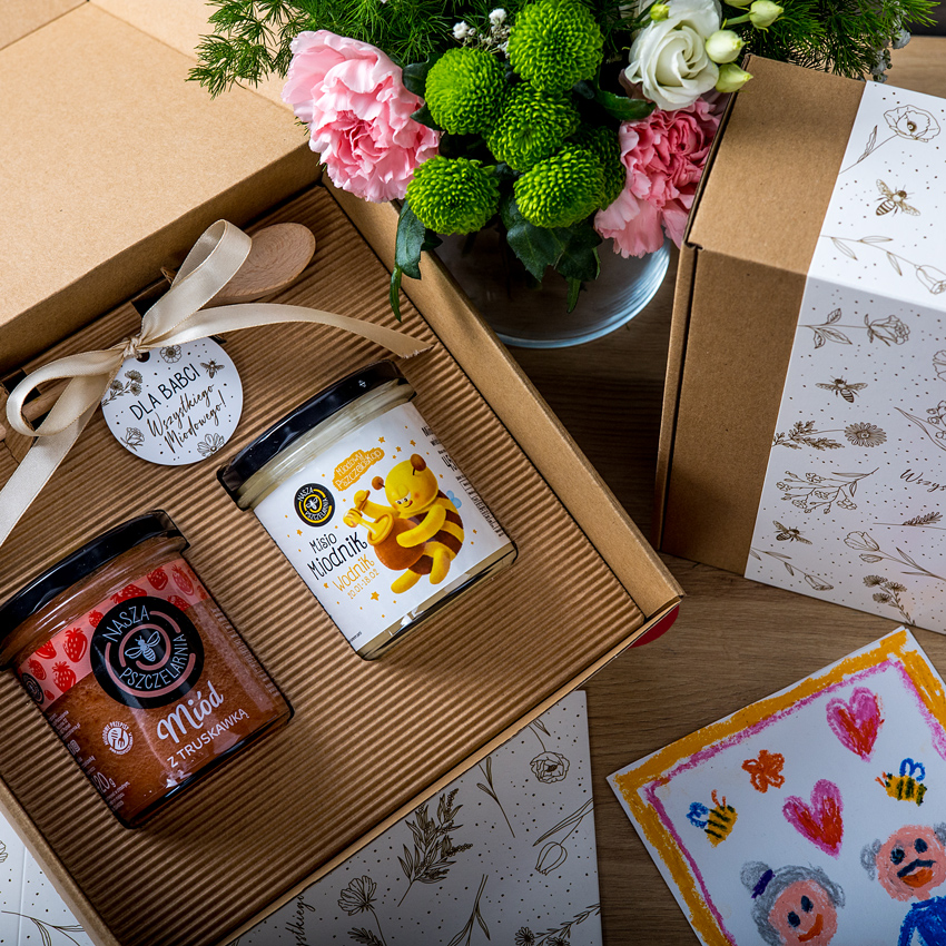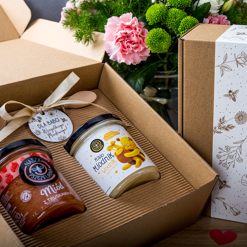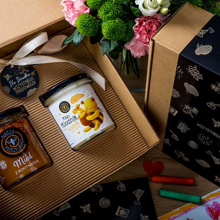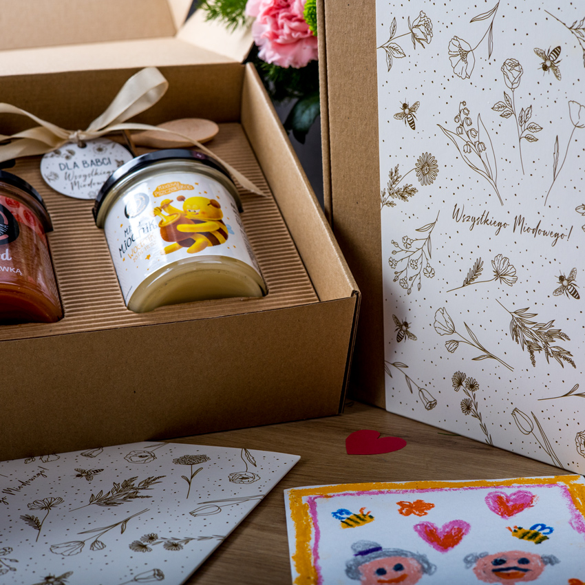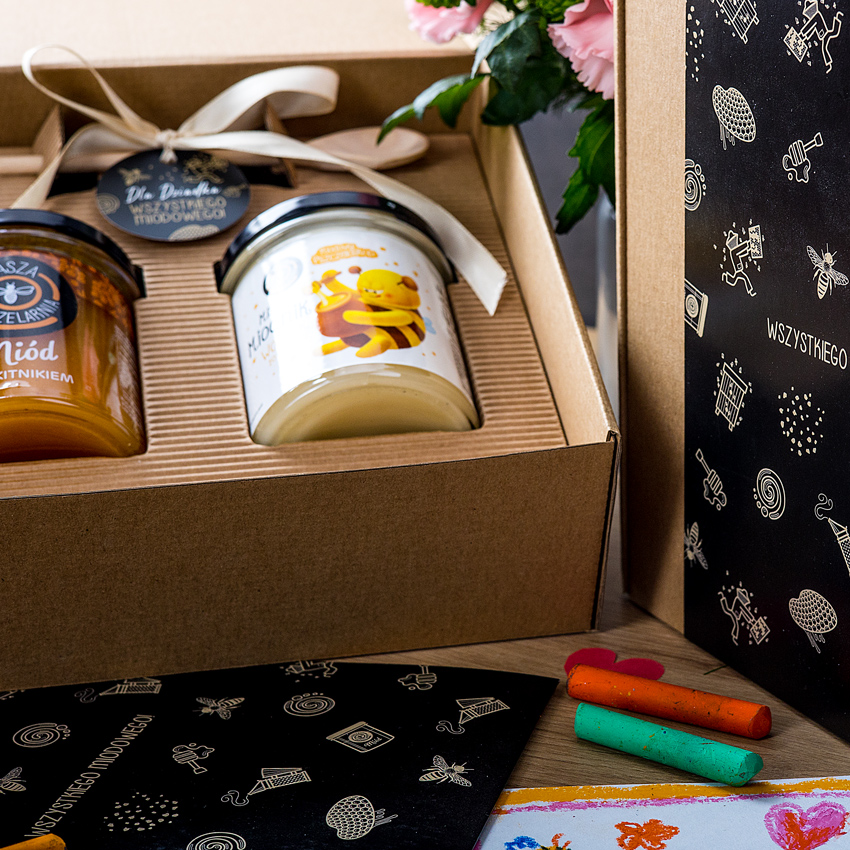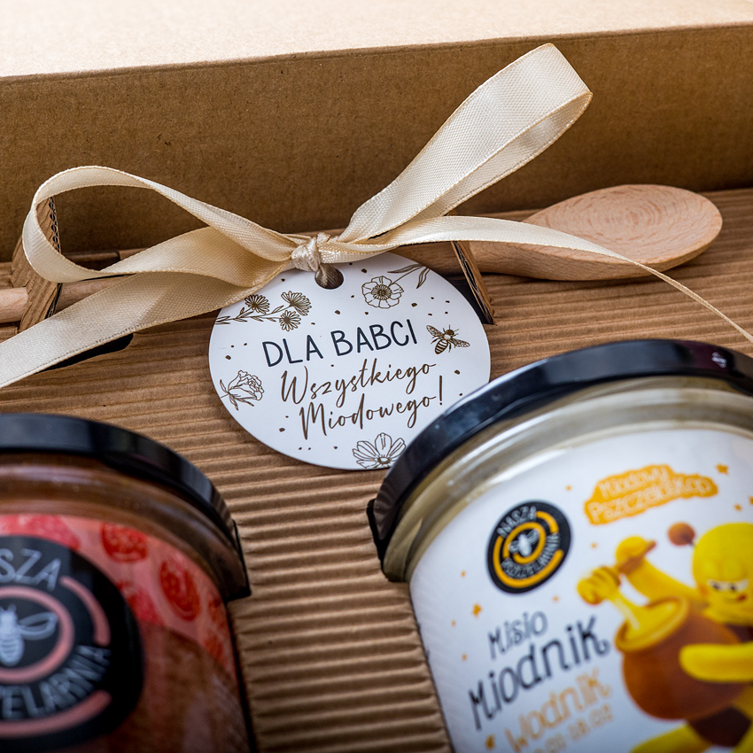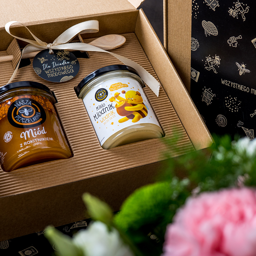 W tym eleganckim pudełku w opasce okolicznościowej znajdziesz idealny upominek dla Babci lub Dziadka. Wybierz etykietę na miód wielokwiatowy z jednym ze znaków zodiaku oraz smak drugiego miodu dla obdarowywanej osoby, niech poczuje się naprawdę słodko!