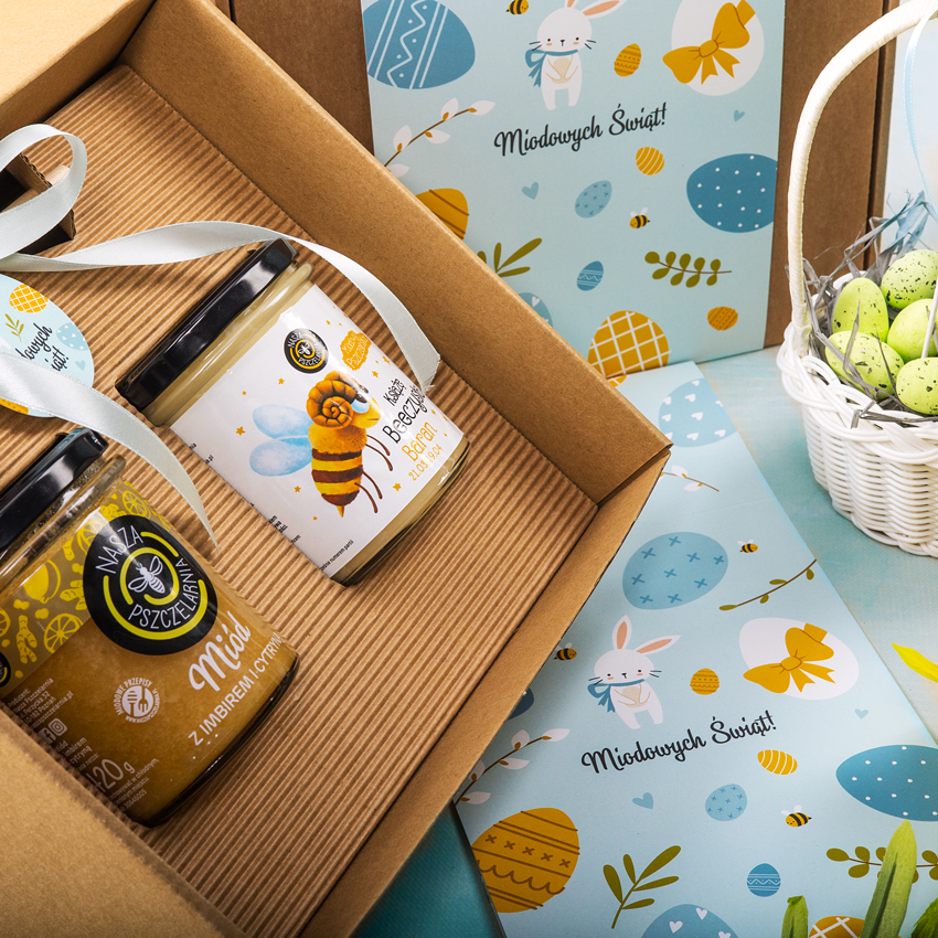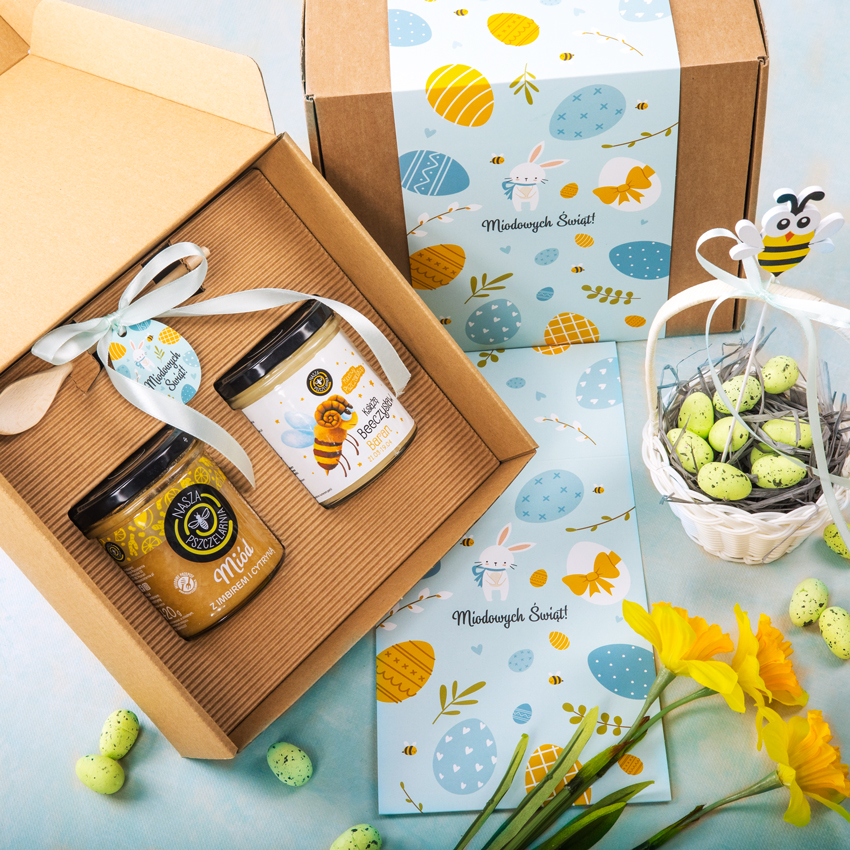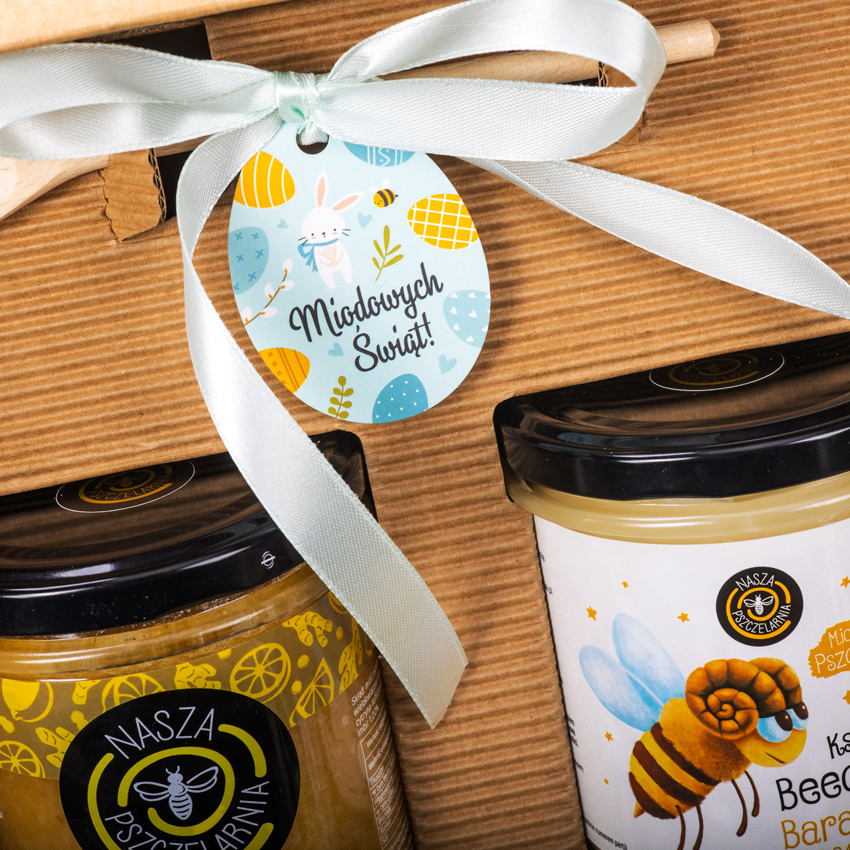 Zestaw upominkowy na Wielkanoc w pudełku kartonowym z opaską okolicznościową, zawieszką i łyżeczką z 1 miodem 420g/450g i z 1 miodem wielokwiatowym ze znakiem zodiaku do wyboru. Pokaż swoim bliskim, że o nich pamiętasz!