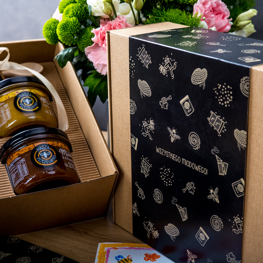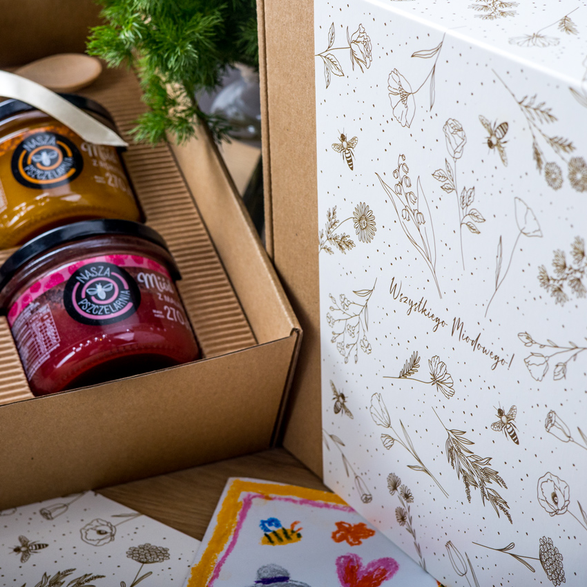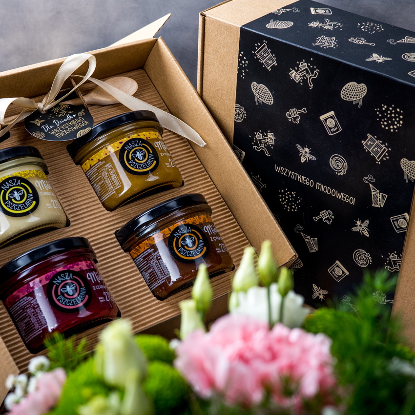 - Pudełko kartonowe na 4 wybrane miody 300g/270g