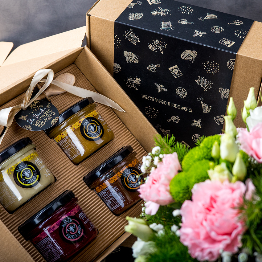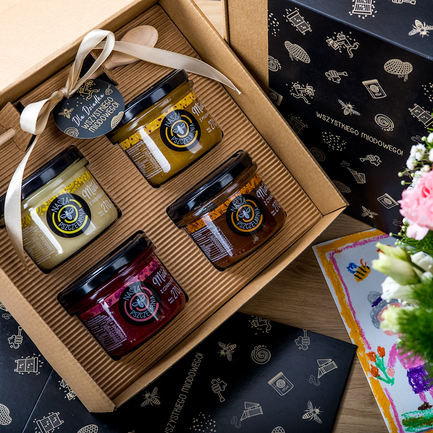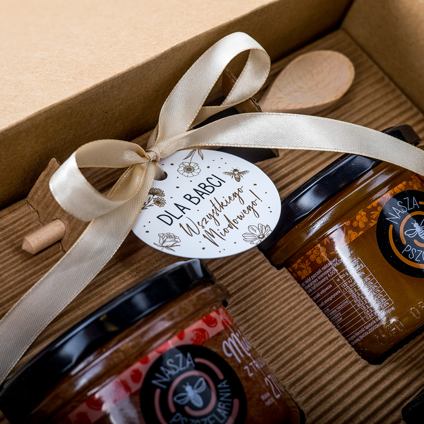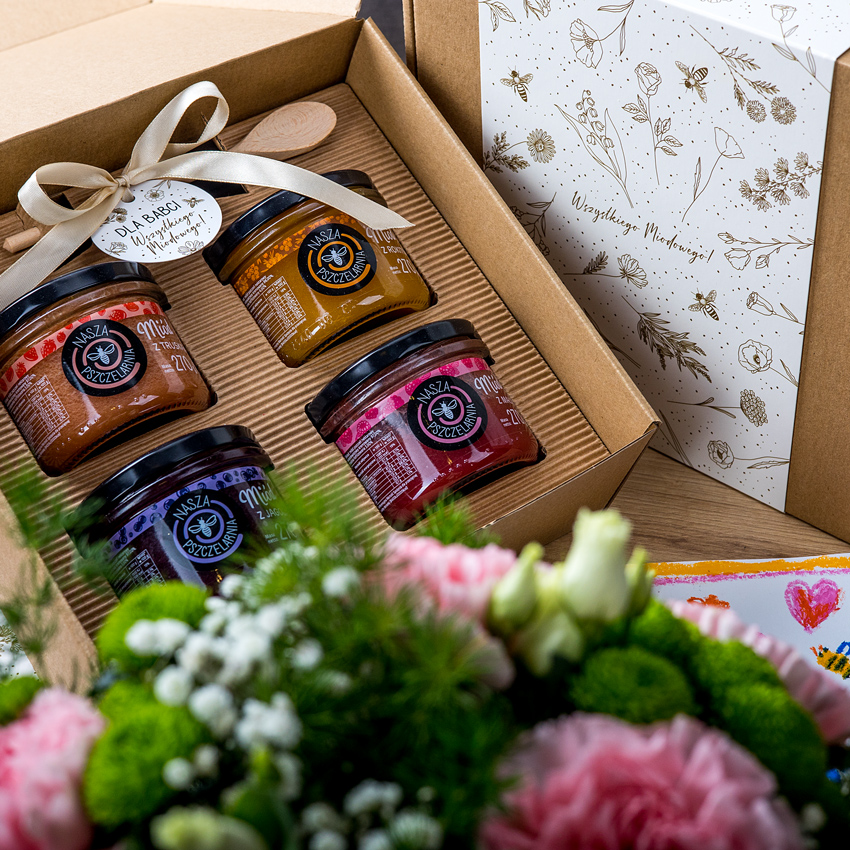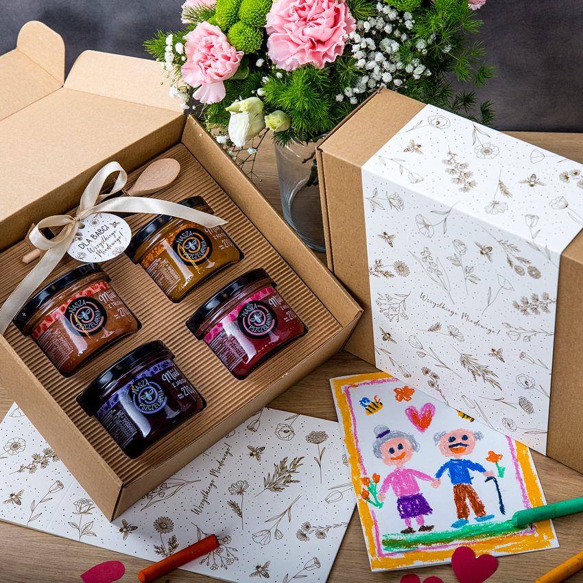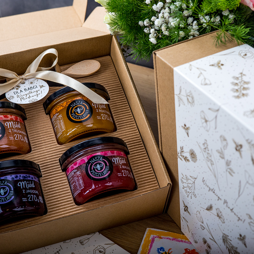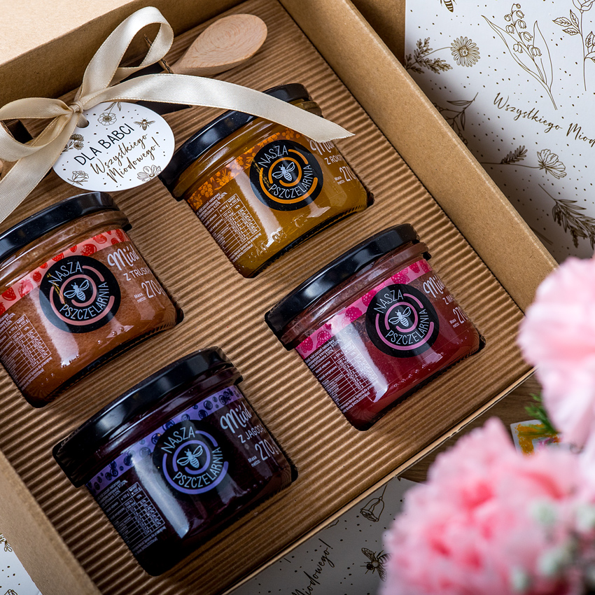 W tym eleganckim pudełku w opasce okolicznościowej znajdziesz idealny upominek dla Babci lub Dziadka. Wybierz 4 smaki miodu dla obdarowywanej osoby, niech poczuje się naprawdę słodko!