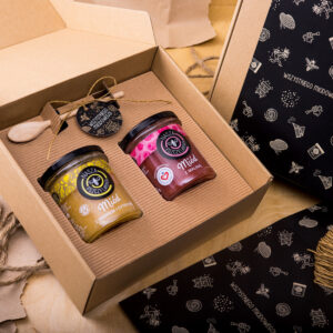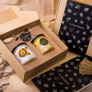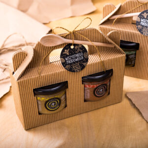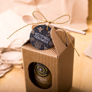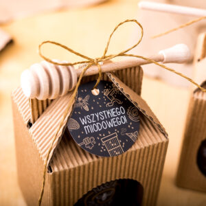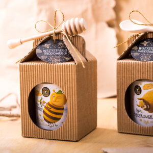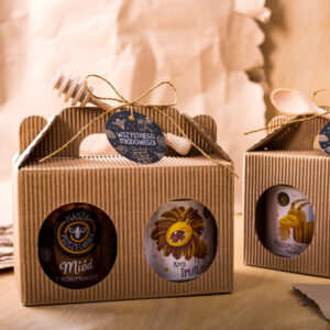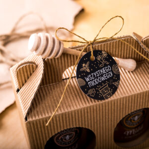 Skoro miód jest tak wspaniałym produktem, dlaczego by nie zrobić z niego eleganckiego zestawu prezentowego? W Naszej Pszczelarni przygotowaliśmy dla Ciebie zestawy prezentowe z miodem na każdą okazję. W eleganckim pudełku z okolicznościową opaską możesz stworzyć własną, spersonalizowaną kompozycję. Możesz wybrać kolor opaski: biały, beżowy czy różowy, a do tego dobrać zawieszkę z dedykowaną wiadomością. Do pudełka możesz dobrać nawet cztery różne smaki miodu, co sprawi, że obdarowana osoba poczuje się słodko i wyjątkowo.