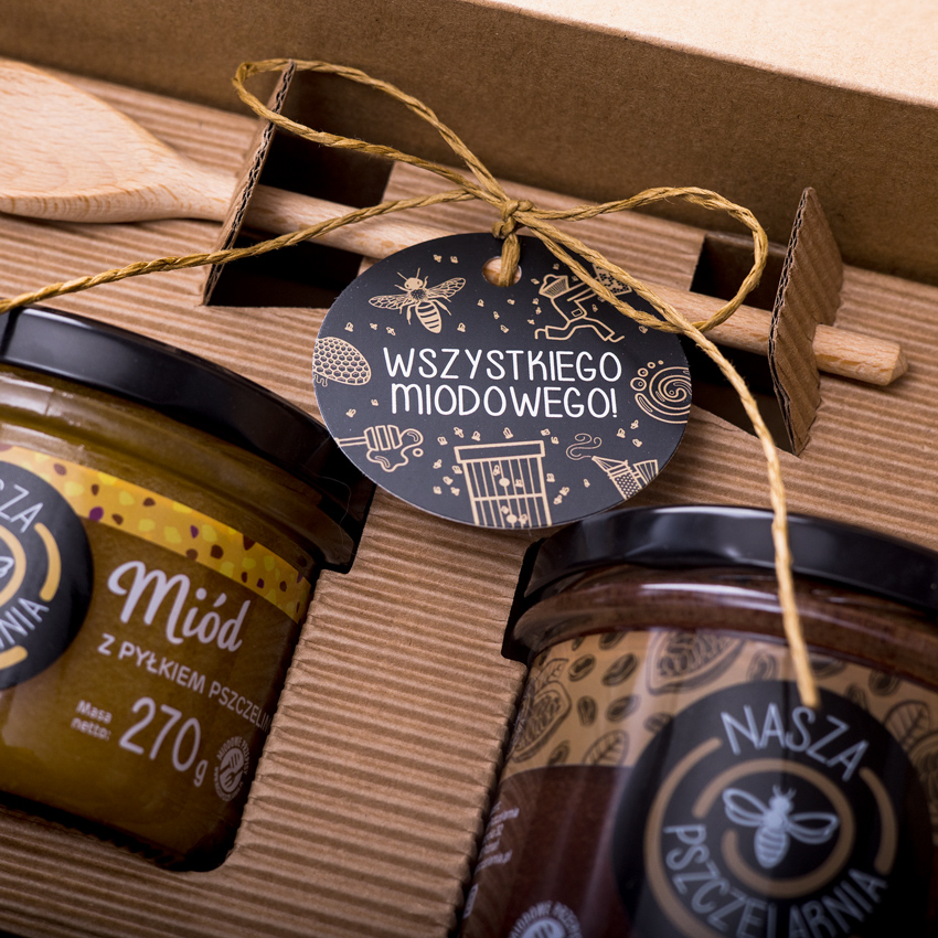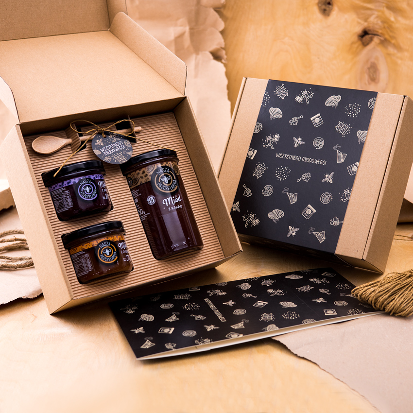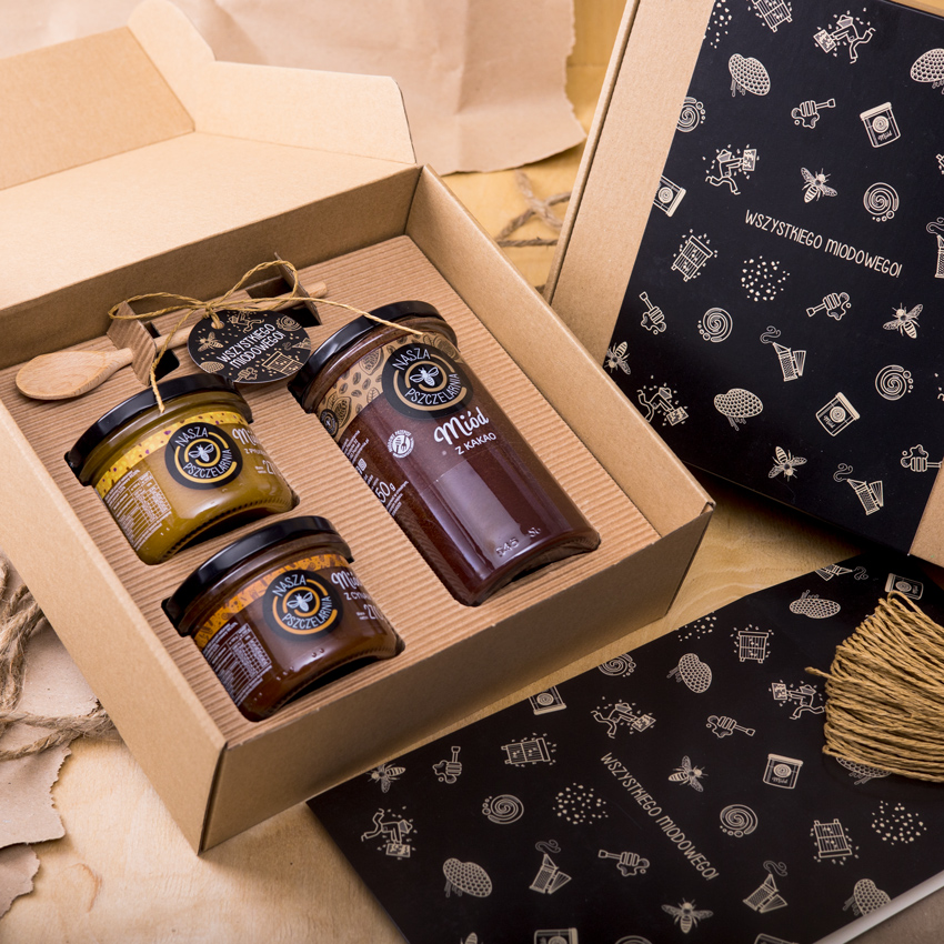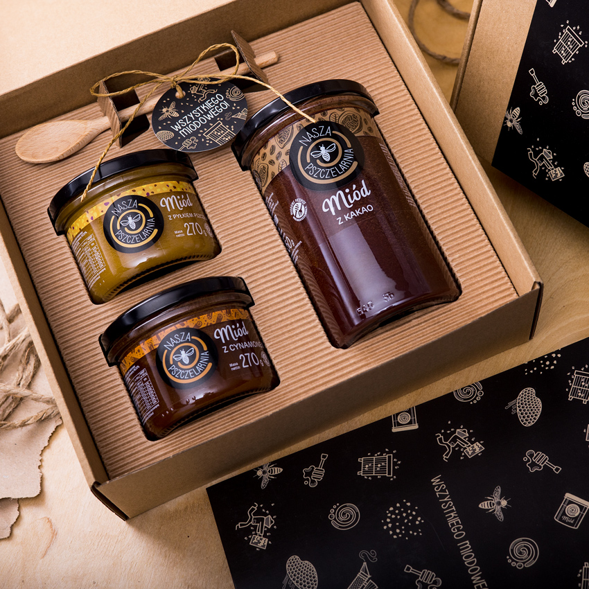 W tym eleganckim pudełku w opasce okolicznościowej znajdziesz idealny upominek na każdą okazję. Wybierz jedną z pięciu zawieszek. Skompletuj 3 smaki miodu dla obdarowywanej osoby, niech poczuje się naprawdę słodko!
