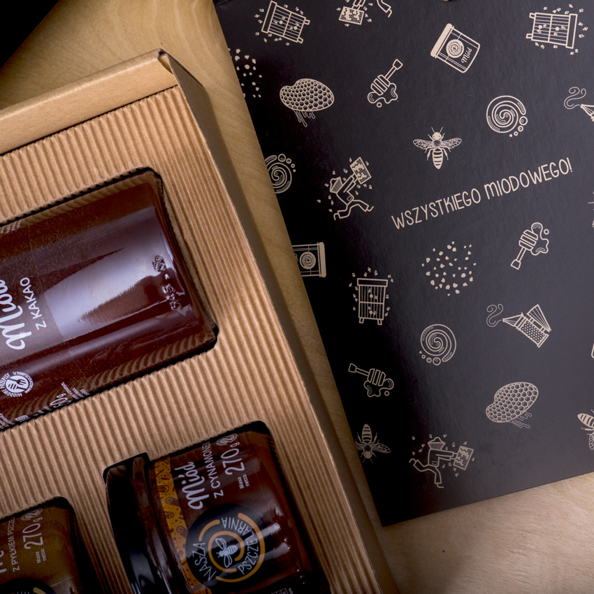 - Pudełko kartonowe na wybrany 1 miód 650g i 2 wybrane miody 300g/270g