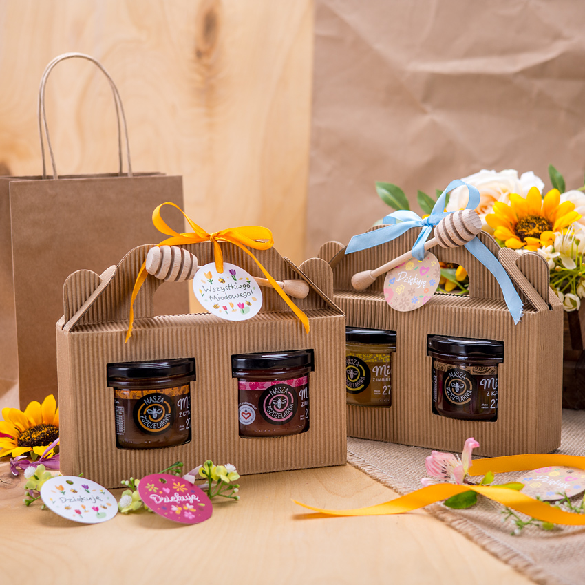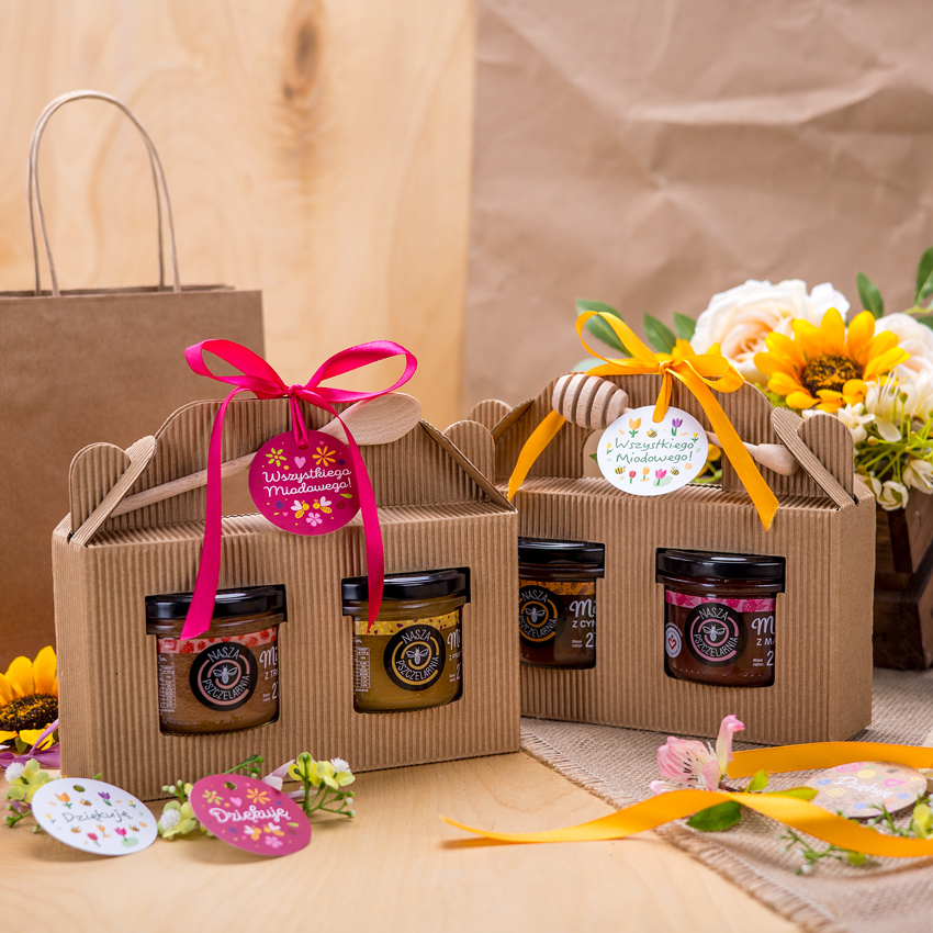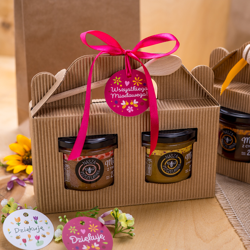W tym eleganckim kartoniku z zawieszką okolicznościową w 3 kolorach do wyboru znajdziesz idealny upominek na Dzień Kobiet. Wybierz 2 smaki miodu dla obdarowywanej osoby, niech poczuje się naprawdę słodko!