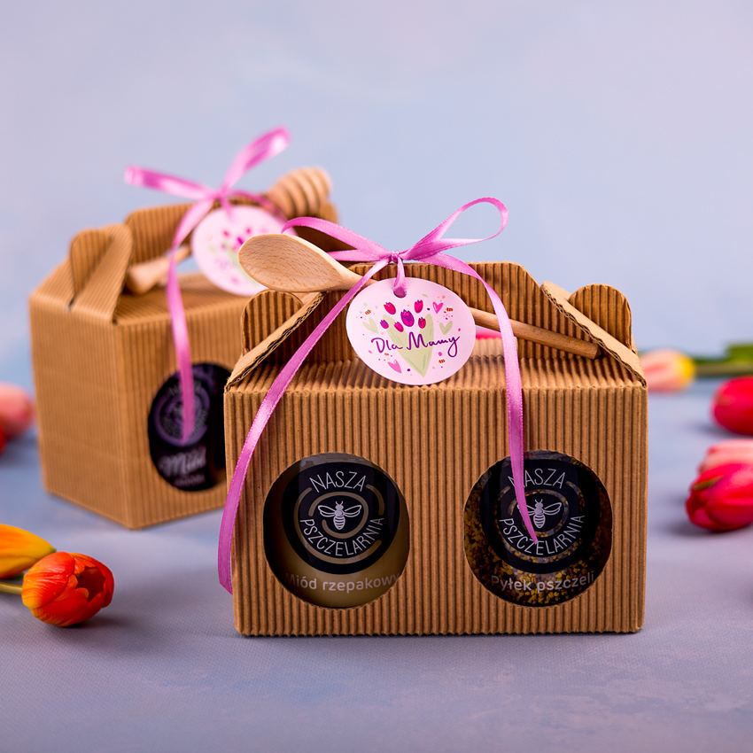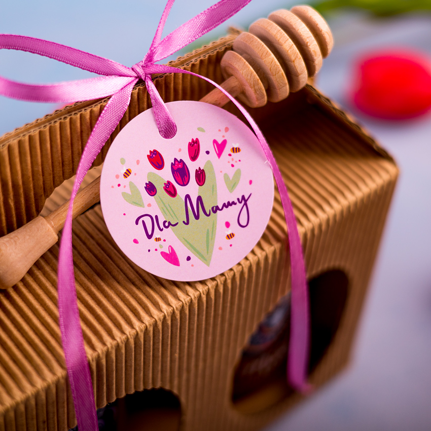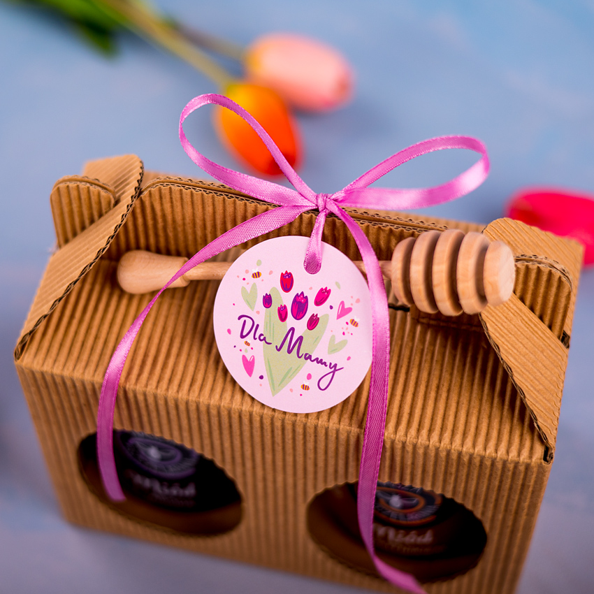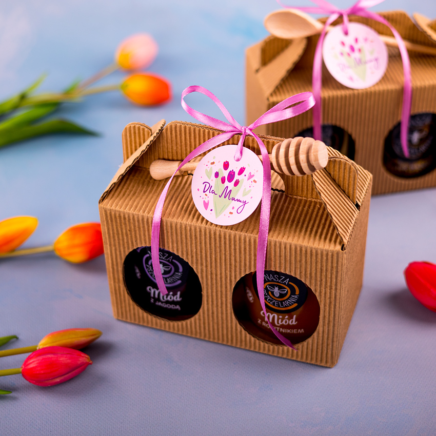 W tym eleganckim kartoniku z zawieszką okolicznościową do wyboru znajdziesz idealny upominek na Dzień Matki. Wybierz 2 smaki miodu dla obdarowywanej osoby, niech poczuje się naprawdę słodko!