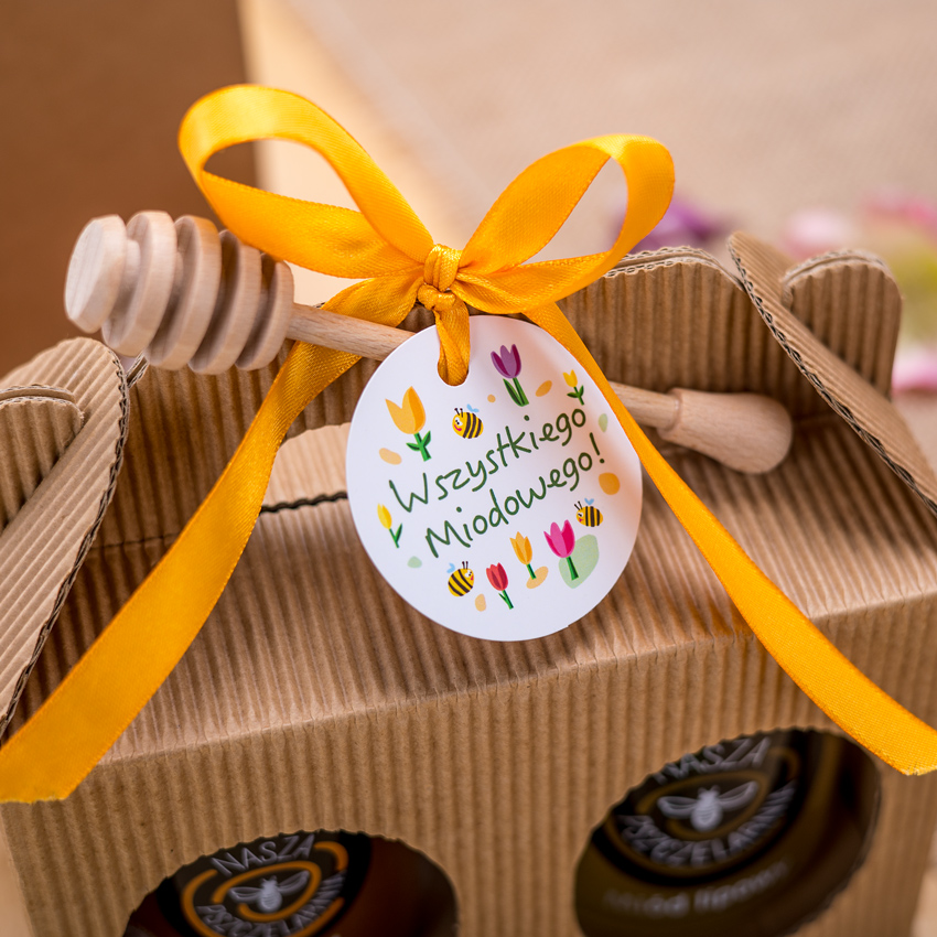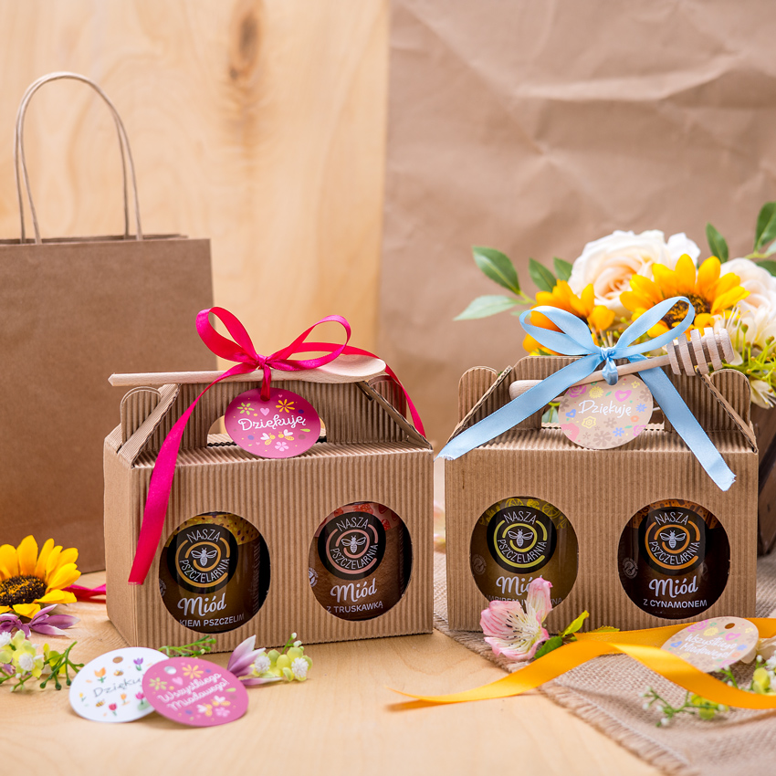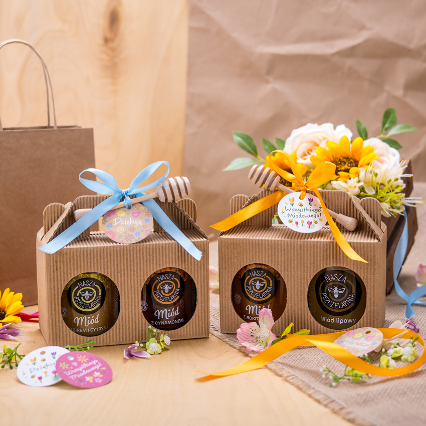 W tym eleganckim kartoniku z zawieszką okolicznościową w 3 kolorach do wyboru znajdziesz idealny upominek na każdą okazję. Wybierz 2 smaki miodu dla obdarowywanej osoby, niech poczuje się naprawdę słodko!