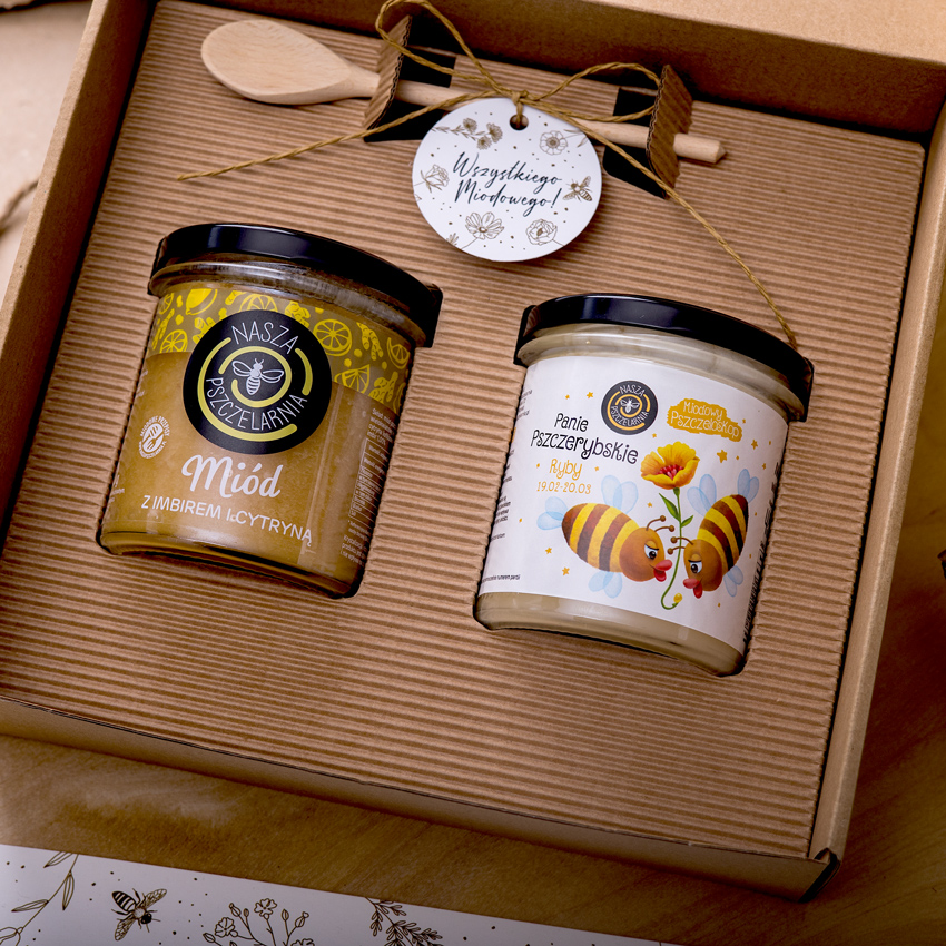 W tym eleganckim pudełku w opasce okolicznościowej znajdziesz idealny upominek na każdą okazję. Wybierz jedną z pięciu zawieszek. Wybierz etykietę na miód wielokwiatowy z jednym ze znaków zodiaku oraz smak drugiego miodu dla obdarowywanej osoby, niech poczuje się naprawdę słodko!