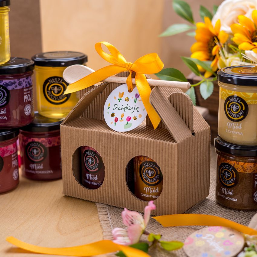 W tym eleganckim kartoniku z zawieszką okolicznościową w 3 kolorach do wyboru znajdziesz idealny upominek na Dzień Kobiet. Wybierz 2 smaki miodu dla obdarowywanej osoby, niech poczuje się naprawdę słodko!