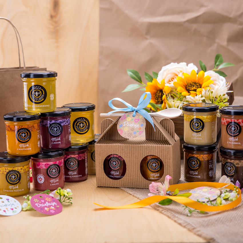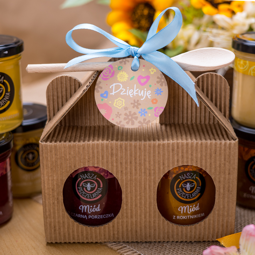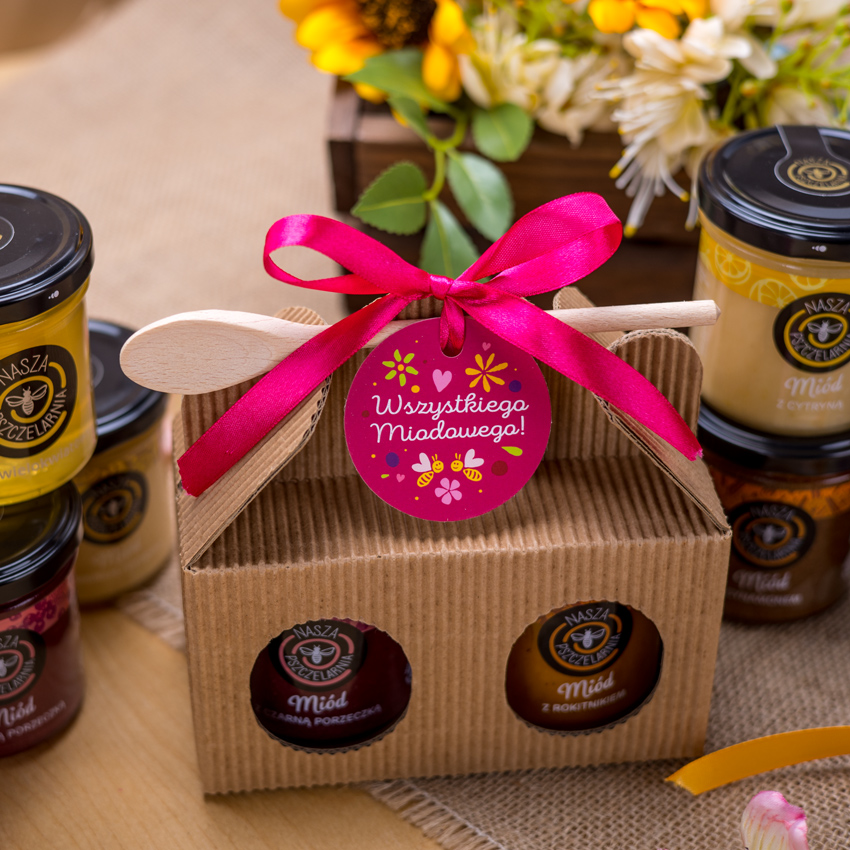 W tym eleganckim kartoniku z zawieszką okolicznościową w 3 kolorach do wyboru znajdziesz idealny upominek na każdą okazję. Wybierz 2 smaki miodu dla obdarowywanej osoby, niech poczuje się naprawdę słodko!