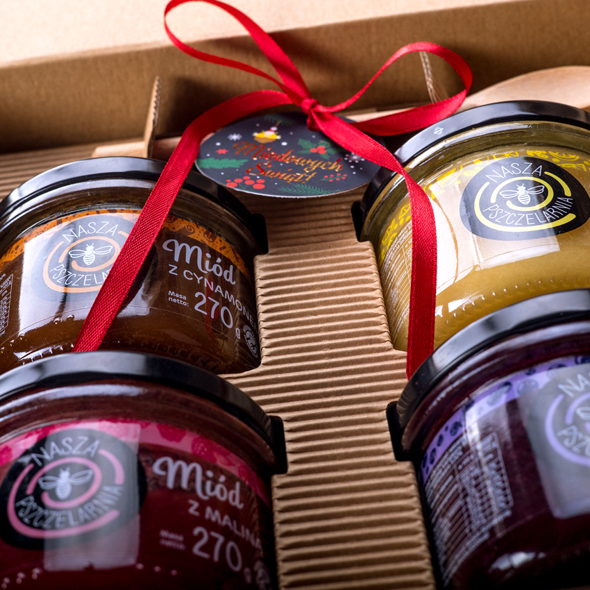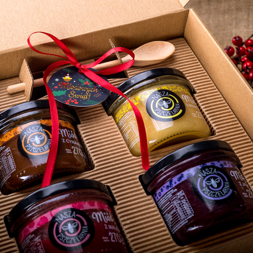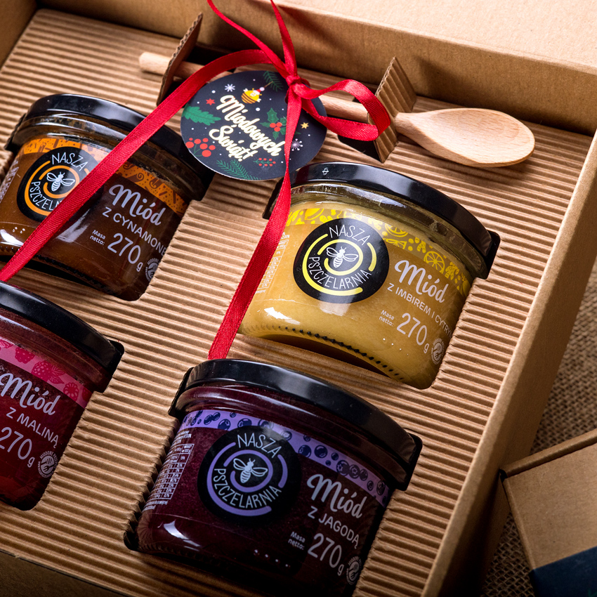 W tym eleganckim pudełku w opasce okolicznościowej znajdziesz idealny upominek na zbliżające się święta Bożego Narodzenia. Wybierz 4 smaki miodu dla obdarowywanej osoby, niech poczuje się naprawdę słodko!