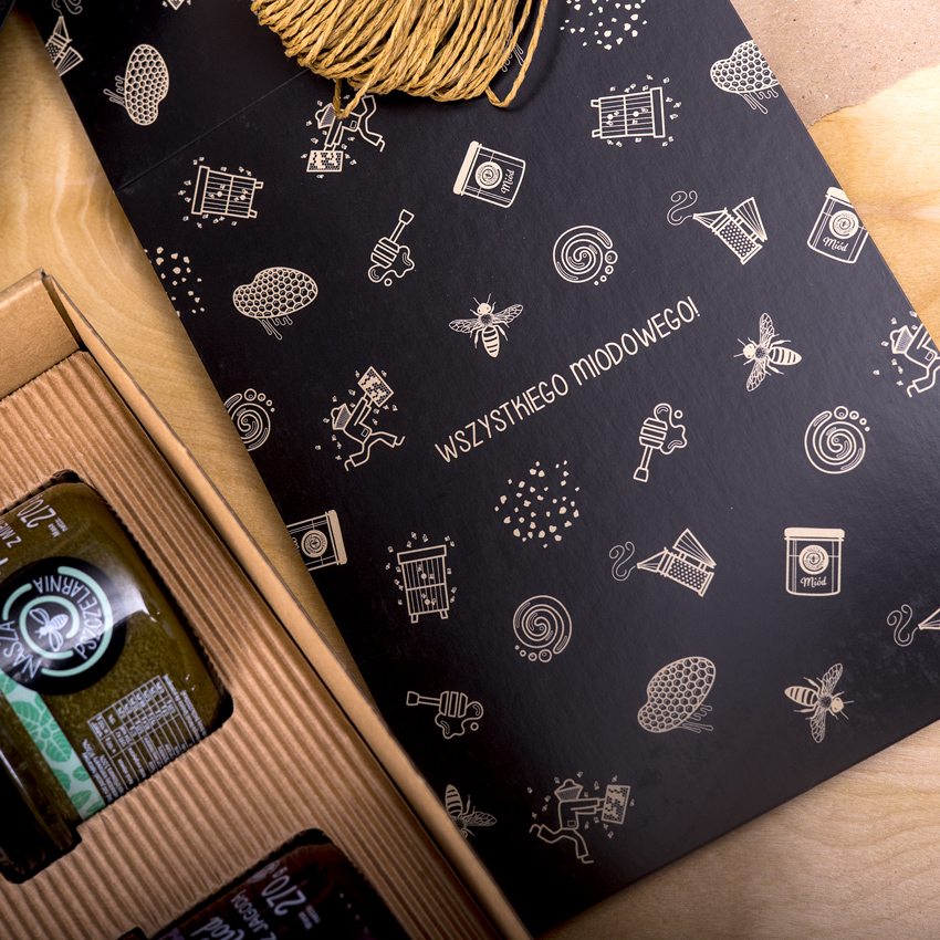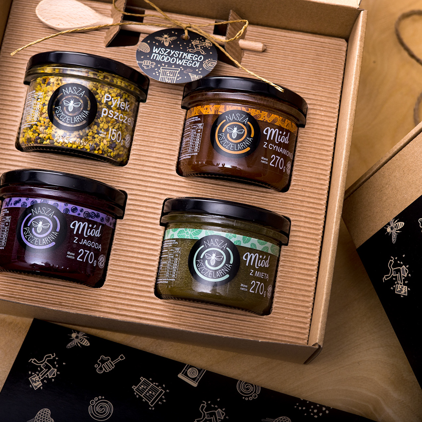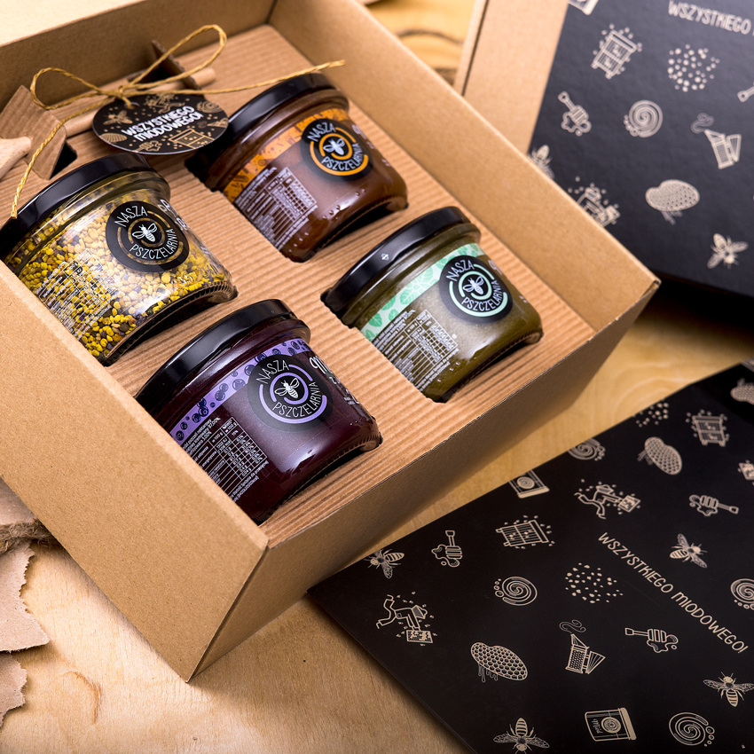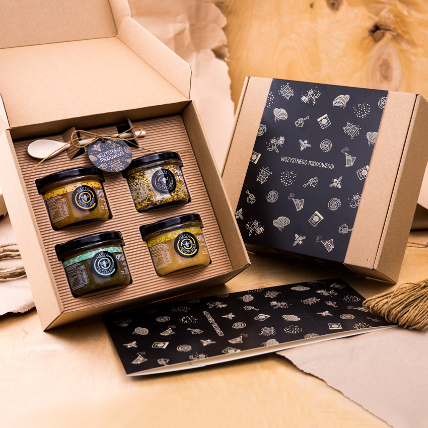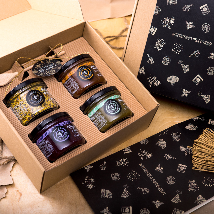 - Pudełko kartonowe na 4 wybrane miody 300g/270g
