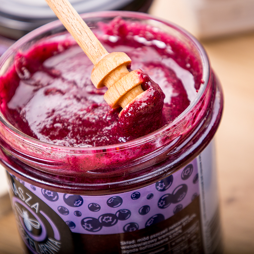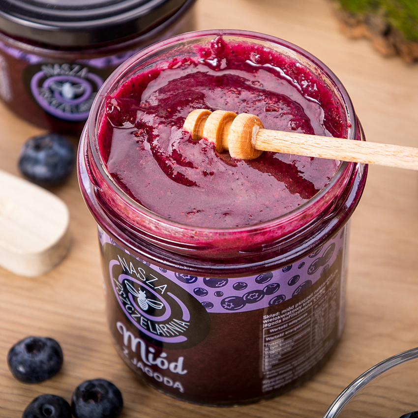 Miód z jagodami to naturalne źródło antyoksydantów i witaminy C, korzystnie wpływa na wzrok i działa odmładzająco na skórę i organizm.