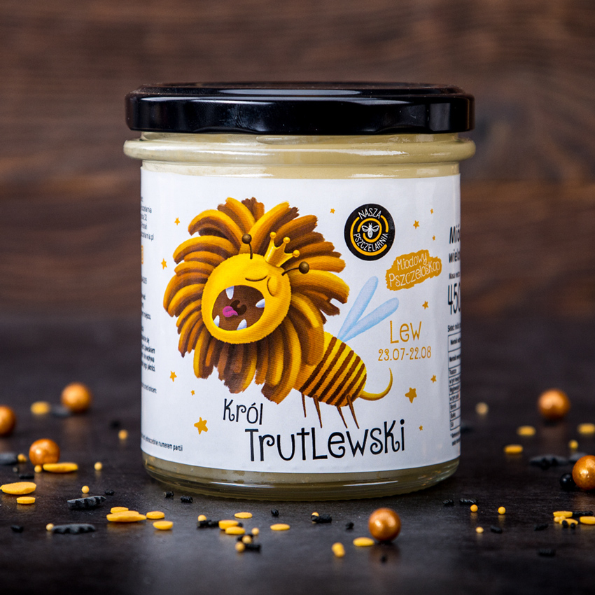 Zodiakalny Lew to nasz Król Trutlewski, czyli charyzmatyczny, szlachetny, serdeczny i lojalny osobnik. Te pszczoły są z natury silne, ale jednocześnie wrażliwe i emocjonalne. Jak na prawdziwego króla przystało, uwielbiają być w centrum uwagi i zazwyczaj udaje im się to doskonale. Dzięki niebywałej wręcz energii i radości życia doskonale odnajdują się w dużej grupie, której nierzadko przewodzą. Ambicja pozwala wyznaczać lwom jasne cele i uparcie do nich dążyć. W środku słoika znajdziesz nasz w 100% naturalny miód wielokwiatowy (450g). Idealny prezent na urodziny lub inną okazję.