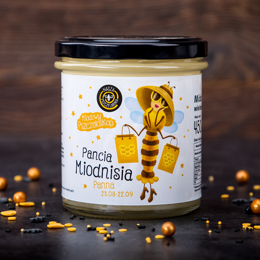 Pancie Miodnisie, to pszczółki, które są zwykle bardzo dokładne i dbają o szczegóły. Starają się być perfekcyjne w tym, co robią, kierują się rozumem i logiką. Są odpowiedzialne i godne zaufania, dlatego gdy w ulu dzieje się coś niepokojącego pańcie Modnisie potrafią przejąć kontrolę i pokierować sytuacją. Nie ma w tym nic dziwnego – są bardzo inteligentne i praktyczne. W sierpniu i wrześniu Panny mogą odczuć wzrost energii oraz entuzjazmu do działania. To czas, w którym powinny wykorzystać szansę na rozwijanie swoich umiejętności! W środku słoika znajdziesz nasz w 100% naturalny miód wielokwiatowy (450g). Idealny prezent na urodziny lub inną okazję.
