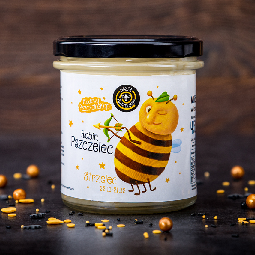 Robin Pszczelec to prawdziwy optymista. Pełny pasji i energii, uwielbia latać daleko i poznawać kultury innych pasiek. To prawdziwy poszukiwacz przygód oraz wyzwań. Choć nieco zmiennt i beztroski, w przyjaźni i pszczelej pracy jest stały i wytrwały. Ta niespokojna duchem pszczółka nigdy się nie nudzi, jest otwarty na nowe doświadczenia i zawsze gotowa do lotu! W środku słoika znajdziesz nasz w 100% naturalny miód wielokwiatowy (450g). Idealny prezent na urodziny lub inną okazję.
