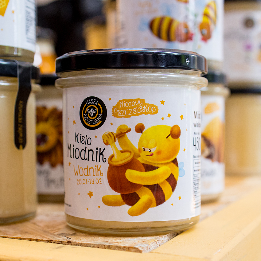 Misio Miodniki – uczciwe, pełne ambicji i poczucia sprawiedliwości, ciekawe świata, uzdolnione, oryginalne i wyzwolone – tak w kilku słowach można opisać wszystkie Wodniki. Misio Miodniki to jedne z najbardziej uduchowionych stworzeń, które uwielbiają eksperymentować i rewolucjonizować. Poszukując innowacyjnych rozwiązań, wymyślają śmiałe idee i zawsze lecą w kierunku przyszłości. Z radością czekając na to, co jeszcze nieznane i nieodkryte. W środku słoika znajdziesz nasz w 100% naturalny miód wielokwiatowy (450g). Idealny prezent na urodziny lub inną okazję.